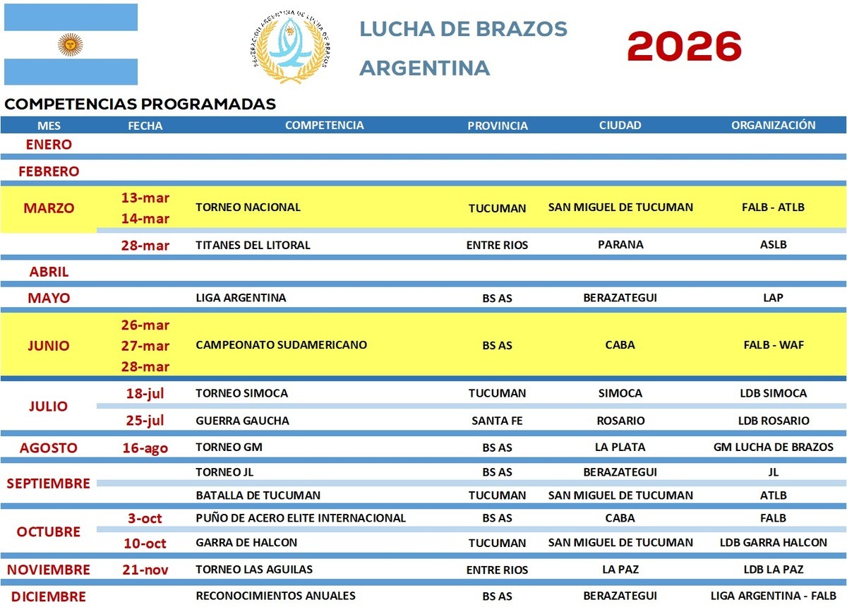 Puede haber torneos durante el año que al momento no han sido informados y se informarán con el transcurso de los meses.